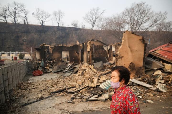 The wildfires have carved a trail of devastation through an area equivalent to about half of Singapore, ravaging everything in their path including historic temples and homes in the mountainous forest regions of North Gyeongsang province.