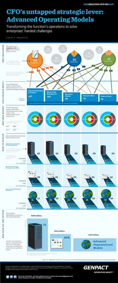 Specifically, financial planning and analysis (FP&A) and master data management (MDM) have emerged as two key areas to watch. Finally, executives believe that three levers of operating model transformation – technology, process reengineering, and advanced organizational structures such as shared services and business process outsourcing – create impact very differently.