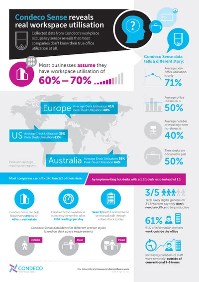 Andrew Howells, Head of Workspace Consultancy at Condeco said: “Condeco Sense is revolutionising the way organisations are able to measure space utilisation, removing the need for traditional and expensive manual walk-through studies. By having a constant flow of utilisation data to hand, companies are able to accurately create an agile working environment, reduce real estate costs and decrease office churn. We are measuring thousands of spaces for companies from the US to Australia and seeing average desk utilisation rates rarely get above 40%. The data is a real eye opener for most companies as it instantly shows what the real estate options are.”