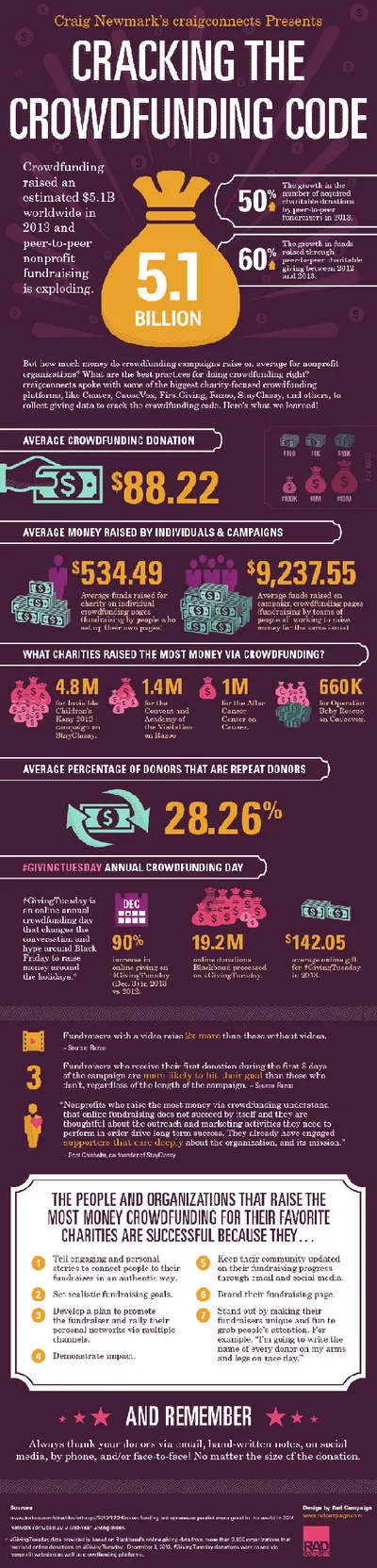 Other information details various crowdfunding results such as the average online donation to campaigns, the success of the crowdfunding initiative #GivingTuesday, and the best practices of nonprofits that have raised a significant amount of money with this newer fundraising tool.
