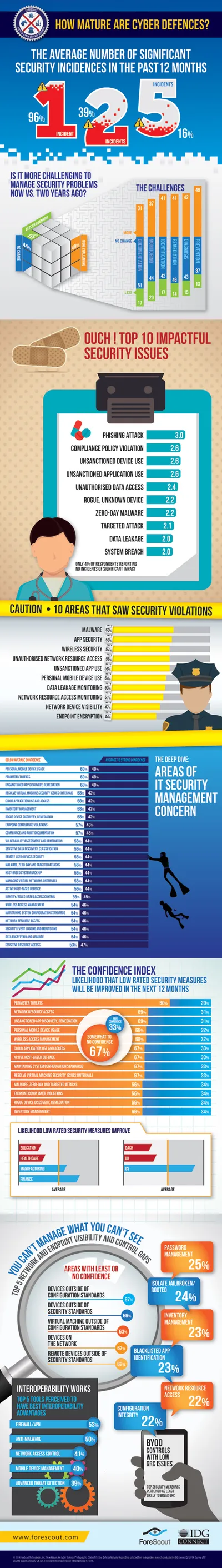 - Control practices indicated as relatively immature were personal mobile device usage, perimeter threats, inventory management and endpoint compliance, virtualisation security, rogue device and application security. However, only 54 percent of respondents said they were somewhat confident in the likelihood of improvement over the next 12 months.