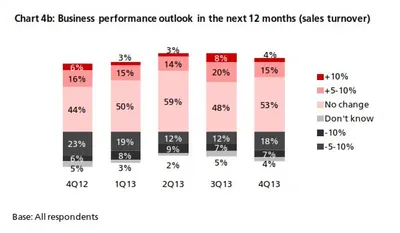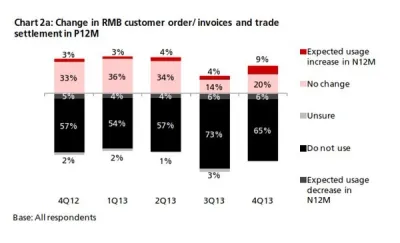 - However, companies using trade services [2] showed growing interest in RMB investment, finance and hedging products. Some 8% of respondents had RMB investments in 4Q13 (vs. 1% in 3Q); 7% of respondents had RMB financing in 4Q13 (vs. <1% in 3Q), and 12% of respondents were using RMB hedging products in 4Q13 (vs. 3% in 3Q). In 4Q13, more companies showed an intention to use RMB letters of credit (6% intend to use in the next 12 months vs. 1% actual usage in the past 12 months), RMB term loans (5% in N12M vs. 1% in P12M) and RMB structured forwards (4% in N12M vs. 1% in P12M)