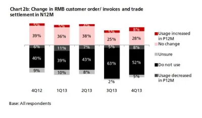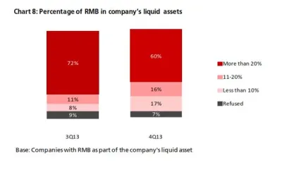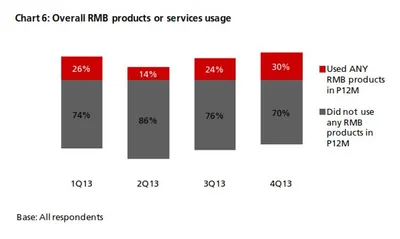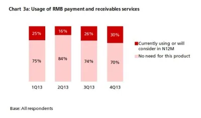 - The number of companies that used any RMB products [1] rose to 30% compared to 24% in 3Q13 (Chart 6). 30% (26%) of companies said they are currently using or will consider using RMB payment and receivables services in the next 12 months. The number of positive responses in 4Q13 is the highest to date (Chart 3a)