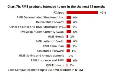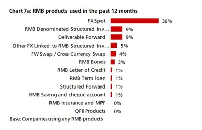 - Of those companies that used any RMB services or products, 36% (57%) used FX spot, but only 9% (10%) had RMB-denominated structured in- vestment deposits and only 1% (5%) had RMB savings and chequing accounts (Charts 7a & 7b).