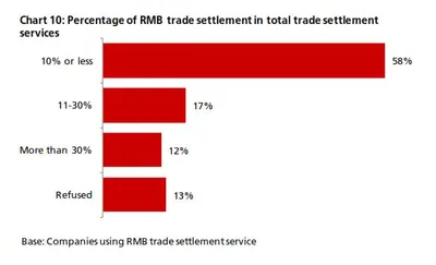 - 29% (24%) of companies [5] reported that RMB trade settlement ac- counted for more than 10% of their total trade settlement services (Chart 10)