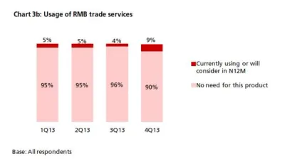 - 9% (4%) of companies said they are currently using or will consider using RMB trade services in the next 12 months. The number of positive responses in 4Q13 is the highest to date (Chart 3b). Of the companies that used trade services (all currencies), 35% (9%) used RMB trade services in the past 12 months. Of those that used trade services (all currencies) but are not currently using RMB trade services, 6% (1%) will consider using them in the next 12 months