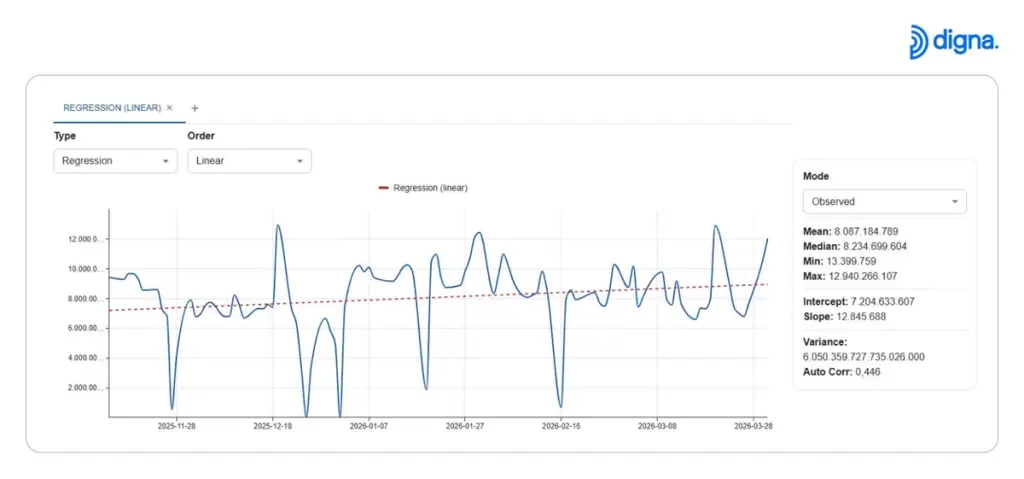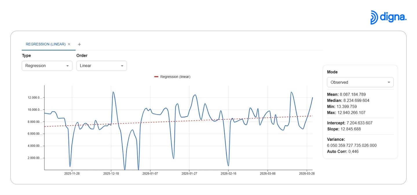 The update introduces a new analytics chart that enables users to analyze time-series data directly within the platform , without requiring dedicated data science resources or external tools. Built-in methods include regression models, smoothing techniques, quantile analysis, and automated identification of trends, seasonality, and pattern changes.