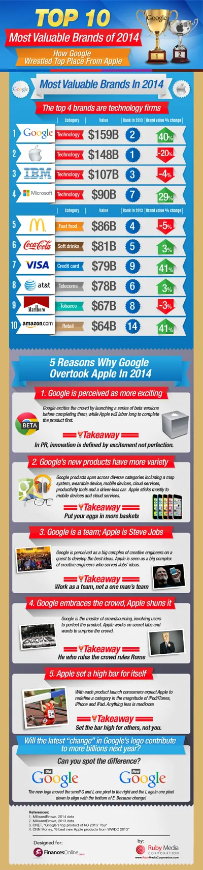 Then Google came out doing exactly the opposite. After dominating search, it would soon launch half-baked disparate projects in the guise of crowdsourcing: Maps, Glass, Shopping Direct, Android apps, even a driver-less car…. Consumers, developers and investors no longer see Google as a search company, but an innovative one. Just this year, Google overtook Apple in the #1 spot, as seen in this infographic comparing the most valuable brands of 2014.