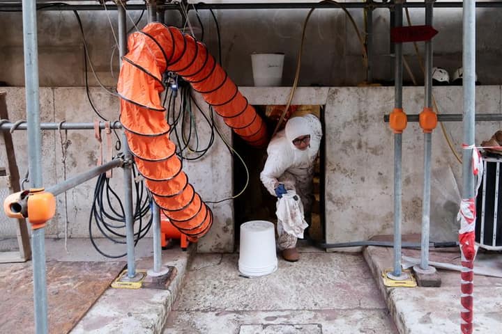 The last clean-up was carried out in the 1980s, but time and the elements take a continuous toll, with conservators finding areas where the marble was starting to detach, requiring swift stabilisation.
