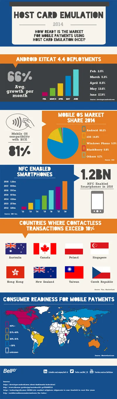 We have developed the below infographic to highlight some of the key statistics that demonstrate the readiness of the market for mass market delivery of mobile services using HCE. The infographic highlights the month-on-month growth of the deployment of Android KitKat 4.4, the percentage of global mobile operating systems that have the potential to support HCE, the countries where contactless mobile payments are likely to achieve swift adoption and global consumer readiness for mobile payments.