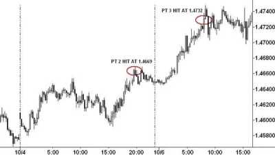 After hitting the buy set-up level at 1.4480, EUR/USD then reversed sharply to trade back at the News Origin price at 1.4543 generating a buy signal with a stop-loss at 1.4479 (just below the session low). Within a few hours the first profit take level (PT 1) was hit at 1.4606 and the stop was moved up from 1.4479 to the breakeven point, thus creating a risk-free trade.