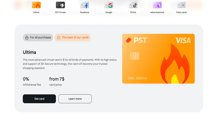 The main highlight of Ultima is its lack of restrictions. You can spend as much as you need, whenever you want. There are also no limits on the number of virtual payment cards you can create on the PSTNET platform. This makes the service an excellent tool for managing finances, such as separating expenses into different categories.